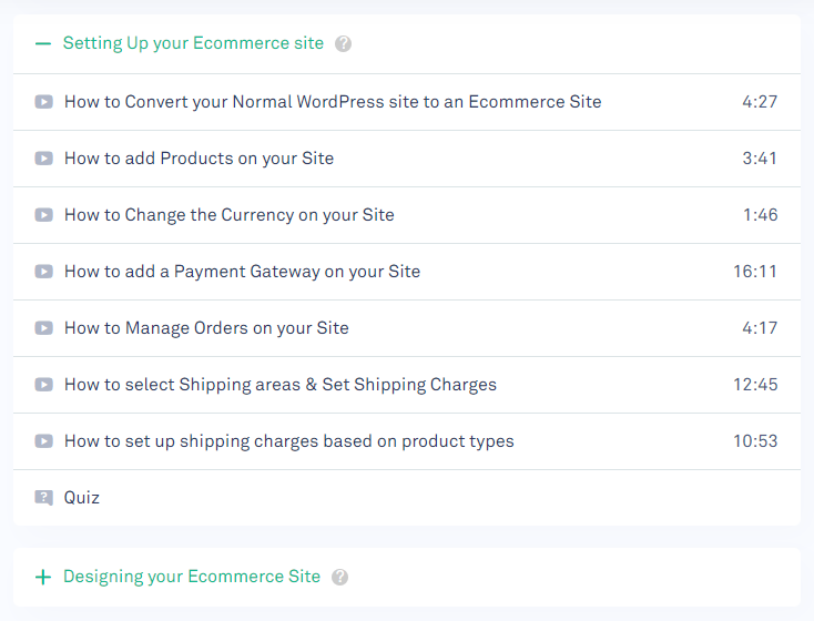 นอกเหนือจากวิดีโอบรรยายทั่วไปแล้ว หลักสูตรอีคอมเมิร์ซของ WordPress ยังมีแบบทดสอบที่ส่วนท้ายของแต่ละส่วนอีกด้วย แบบทดสอบเชิงโต้ตอบดังกล่าวช่วยให้ผู้เรียนมีส่วนร่วมและยังช่วยให้มั่นใจว่าผู้เรียนเข้าใจบทเรียนในแต่ละส่วนอย่างเต็มที่