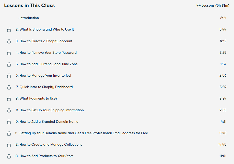 ด้วยการบรรยายมากกว่า 66 ครั้งใน 10 ส่วนที่แตกต่างกัน หลักสูตรพลังของ Shopify มีระยะเวลารวม 4 ชั่วโมง 30 นาที