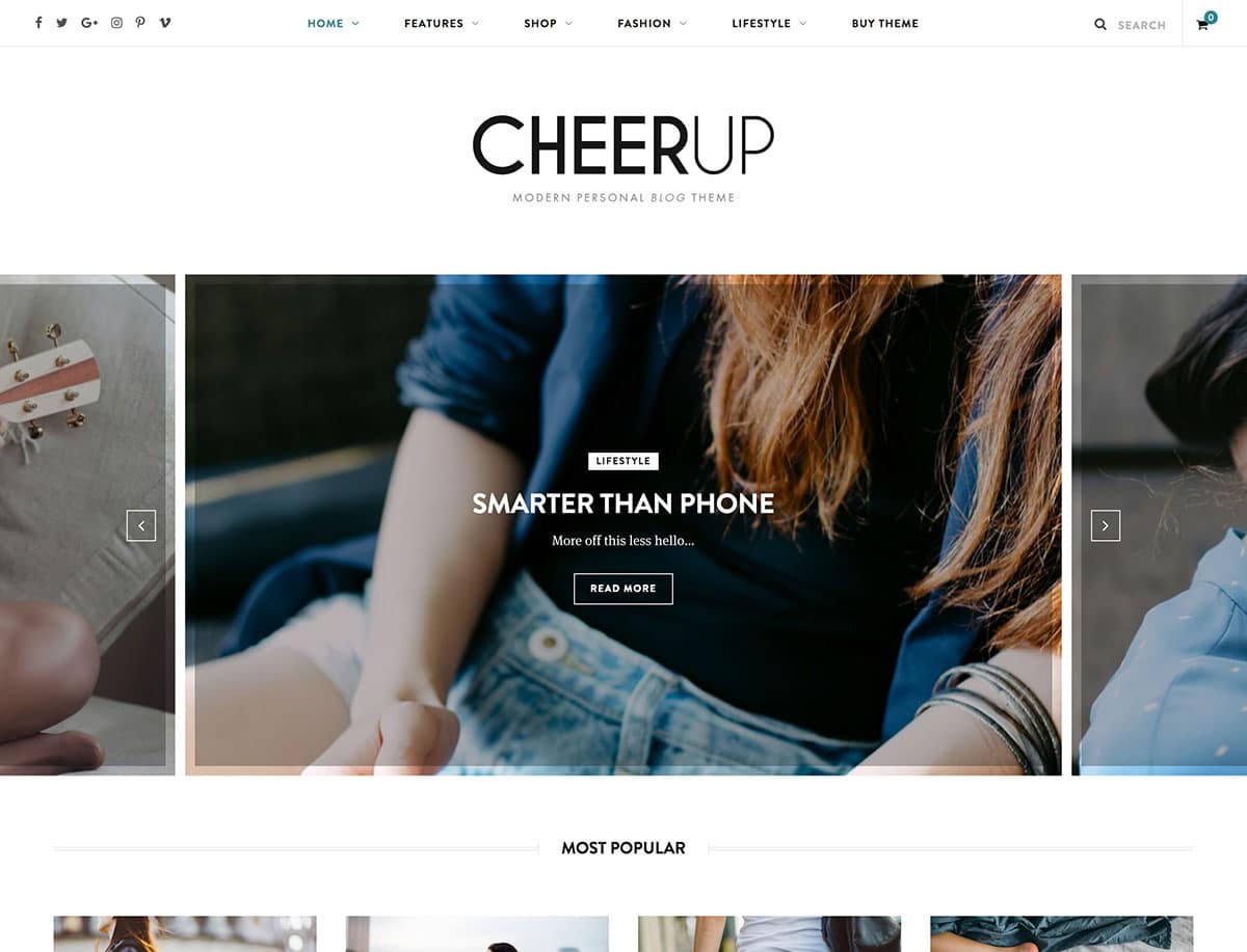 ทำการตลาดเป็น "ธีมหน้าใหม่" CheerUp โดดเด่นอย่างแน่นอน การออกแบบที่สดใสแต่น้ำหนักเบาทำให้ดูมีสไตล์ ทำให้เป็นตัวเลือกที่ดีสำหรับเว็บไซต์เกี่ยวกับแฟชั่นของคุณ ธีมนี้ปรับแต่งได้สูงและมีชุดเค้าโครงที่เป็นไปได้มากกว่า 200 แบบ นอกจากนี้ยังมีฟีเจอร์การแชร์บนโซเชียลมีเดียมากมาย รวมถึงวิดเจ็ตฟีด Instagram ซึ่งเป็นเครื่องมือที่มีประโยชน์สำหรับบล็อกเกอร์แฟชั่นที่เชี่ยวชาญ