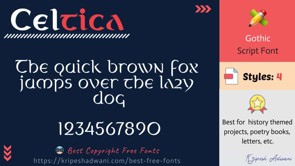 Celtica เป็นฟอนต์แบบกอธิคที่ได้รับแรงบันดาลใจจากจารึกภาษาละตินในสมัยก่อน ฟอนต์สคริปต์ฟรีนี้เหมาะสำหรับการทำงานกับ โปรเจ็กต์การออกแบบแนวประวัติศาสตร์ และยังสามารถใช้เป็นฟอนต์ที่ดีสำหรับ หนังสือประวัติศาสตร์ หนังสือบทกวี จดหมาย ฯลฯ