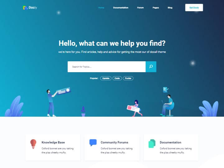 Docly เป็นธีม WordPress ฐานความรู้ที่สามารถใช้สร้างฟอรัม Help Desk ได้ด้วยการผสานรวมกับปลั๊กอิน bbPress เนื่องจาก bbPress สามารถขยายได้ด้วยไลบรารีส่วนเสริม คุณจึงสร้างฟอรัมสนทนาได้เกือบทุกประเภทสำหรับเว็บไซต์ของคุณเมื่อสร้างด้วยธีมนี้