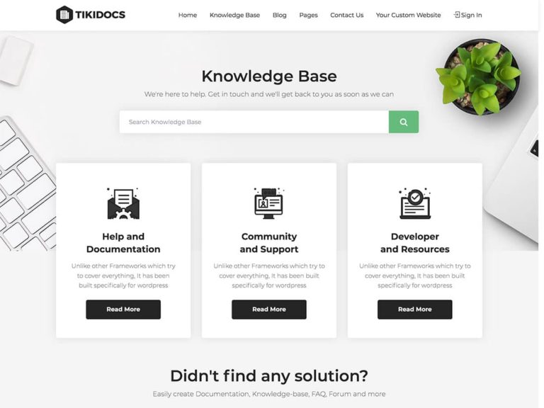 หากคุณลองดูการสาธิตธีม Tikidocs คุณจะเห็นว่าเนื้อหาที่สร้างไว้ล่วงหน้านั้นยึดติดอยู่กับรูปแบบการออกแบบเว็บไซต์ฐานความรู้แบบดั้งเดิม ซึ่งหมายความว่าหากคุณใช้ธีมนี้ในการกำหนดค่าเริ่มต้น เว็บไซต์ของคุณจะมีช่องค้นหาตามด้วยลิงก์ไปยังส่วนยอดนิยมของฐานความรู้ของคุณ เพื่อช่วยให้ผู้เข้าชมของคุณพบสิ่งที่พวกเขากำลังมองหา ช่องค้นหาจึงมีฟังก์ชันการค้นหาแบบสด ดังนั้นเมื่อผู้เยี่ยมชมของคุณเริ่มพิมพ์ ผลลัพธ์ที่เกี่ยวข้องจะแสดงขึ้นทันทีตามข้อมูลที่พวกเขาป้อน