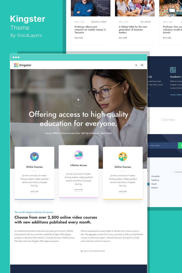 นอกจากนี้ ธีมนี้ยังเหมาะสำหรับการสร้างเว็บไซต์การเรียนรู้ออนไลน์ เว็บไซต์ผู้สอน เว็บไซต์สถาบันการศึกษา เว็บไซต์มหาวิทยาลัย และเว็บไซต์ประเภทอื่นๆ อีกมากมาย