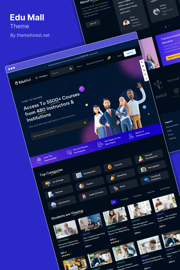eSmarts เป็นระบบการศึกษาและการจัดการการเรียนรู้ที่ทันสมัย WordPress ธีมที่ออกแบบมาโดยเฉพาะสำหรับบทเรียนออนไลน์ การจัดการโรงเรียน ครูสอนพิเศษ และเว็บไซต์ของมหาวิทยาลัย