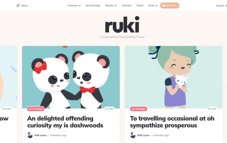 ไม่ว่าคุณจะเป็นศิลปินทัศนศิลป์หรือต้องการให้บล็อกส่วนตัวของคุณใส่รูปภาพจำนวนมาก Ruki อาจเป็นธีมสำหรับคุณ แม้ว่าจะมีการสาธิตที่แตกต่างกันถึงเก้ารายการในแพ็คเกจ Ruki แต่ทั้งหมดนั้นเน้นที่การสร้างบล็อกส่วนตัวที่น่าดึงดูดซึ่งสามารถรวมภาพถ่าย ภาพประกอบ และภาพอื่นๆ ไว้ในงานออกแบบของพวกเขา ตัวอย่างบางส่วน ได้แก่ รูปภาพเด่นจากโพสต์ของคุณที่แสดงบนหน้าเก็บถาวร และส่วนหัวของตัวอย่างบางส่วนซึ่งเหมาะสำหรับการโปรโมตเนื้อหาที่ดีที่สุดของคุณในลักษณะที่ผู้เยี่ยมชมของคุณจะไม่พลาด