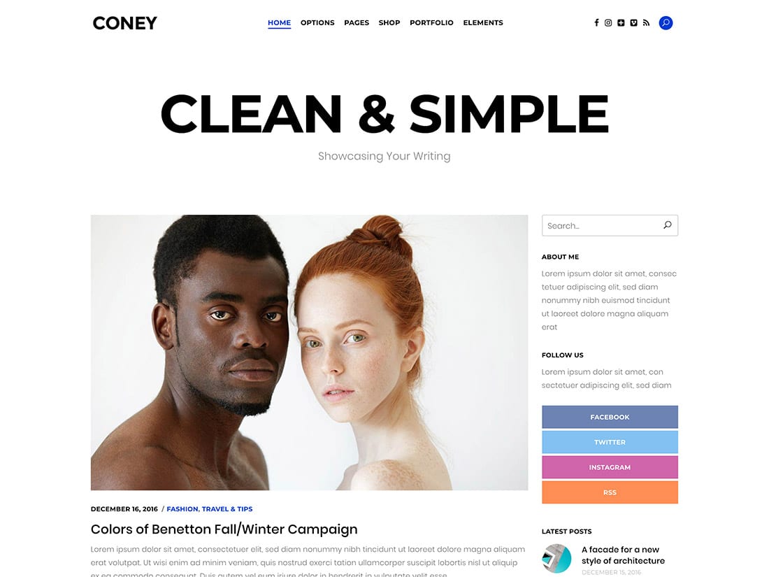 A theme for fashion bloggers, Olsen tries to utilize lots of white space to separate content. However, with both a left and right sidebar employed, the content feels a little cluttered. Removing a sidebar makes things better, but the default small typography choices still don't help to give the feeling of space. Fonts can be easily customized though, as can the layout – with 11 different design choices at your disposal.
