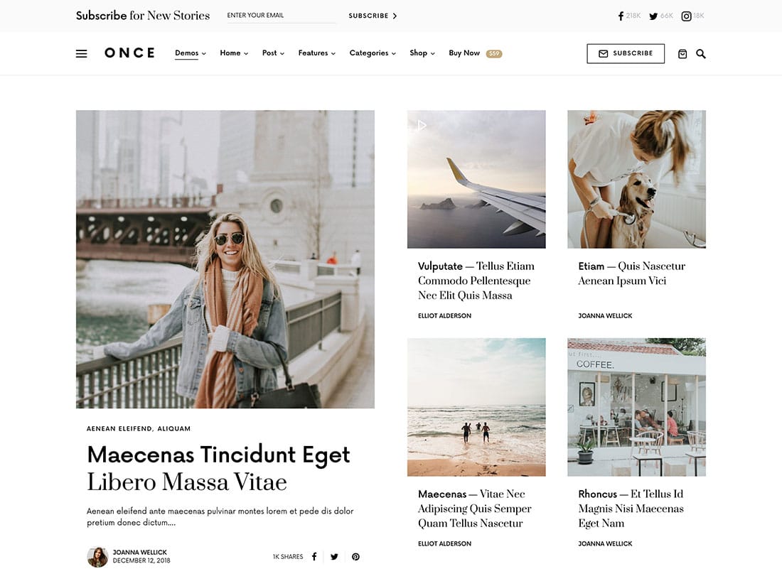 Once เป็นธีมบล็อกส่วนตัวที่สะอาดตาและสวยงามสำหรับ WordPress ที่อัดแน่นไปด้วยเลย์เอาต์และเทมเพลต