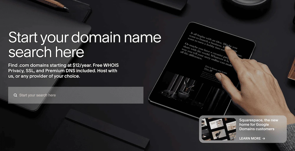 จนกระทั่งเมื่อไม่นานมานี้ Squarespace ไม่มีการจดทะเบียนโดเมน [1] อย่างไรก็ตาม เนื่องจากได้รับบริการ Google Domains [2] คุณจึงสามารถซื้อชื่อโดเมนที่คุณเลือกได้ในระหว่างขั้นตอนการสมัครและตั้งค่า