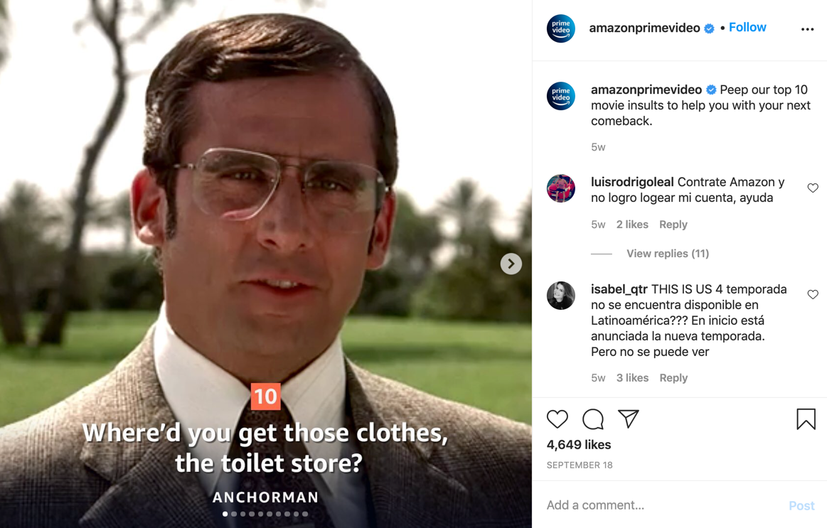 เสียงแบรนด์ของ Amazon Prime Video บนโซเชียลมีเดียให้ความรู้สึกเหมือนแลกเปลี่ยนมส์กับเพื่อนที่ดีที่สุดของคุณ แฟนเกิร์ลที่สนุกสนานและมีชีวิตชีวาของมันเป็นโรคติดต่อ ตลกร้าย และน่าดึงดูดในระดับสากล แบรนด์สื่อถึงน้ำเสียงที่สม่ำเสมอในขณะที่มีภาพยนตร์และรายการทีวีทั้งใหม่และเก่า
