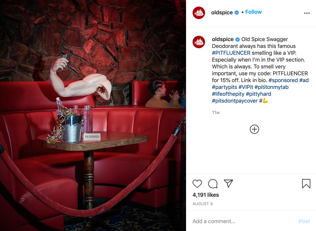 Old Spice สร้างกระแสและจี้กระดูกตลกในปี 2010 ด้วยโฆษณา Old Spice Guy Super Bowl ครั้งแรก ตั้งแต่นั้นมา พวกเขายังคงสร้างแคมเปญการตลาดที่ตลกขบขันด้วยอารมณ์ขันที่ไม่เคารพของผู้ชาย ตัวอย่างเช่น หนึ่งในแคมเปญล่าสุดของพวกเขานำเสนอ "PITFLUENCER" ใหม่ซึ่งเป็นอินฟลูเอนเซอร์บน Instagram ที่สมมติขึ้นซึ่งเป็นรักแร้ที่แท้จริง (และ อืม ตลกดี โบน-ฮาร์ ฮาร์) ภาพถ่ายของ PITFLUENCER แสดงให้เห็นว่าเขากำลังจุ่มบาสเก็ตบอล นอนเล่นที่งานพรมแดง และทำสิ่งสำคัญอื่นๆ ที่ผู้ชายต้องการทำอย่างแน่นอน และน่าจะทำได้ดีกว่านี้หากพวกเขาใช้ Old Spice (เตือนด้วยลิ้น-แก้ม!)