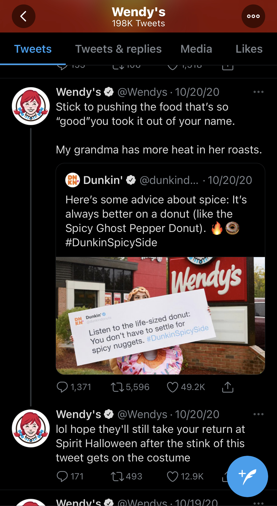 เสียงของแบรนด์ Wendy มีไหวพริบ มีไหวพริบ และเค็มกว่าของทอด บัญชี Twitter ของบริษัทเป็นสถานที่ที่ยอดเยี่ยมในการชมการทำงานของแบรนด์ห่วงโซ่อาหารฟาสต์ฟู้ด Wendy ไม่เพียงแต่มีส่วนร่วมอย่างมากกับผู้ติดตามเท่านั้น แต่ยังรวมไปถึงแบรนด์อาหารจานด่วนอื่นๆ อย่างสนุกสนานอีกด้วย
