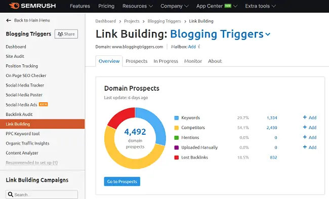 Semrush ได้ออกแบบเครื่องมือสร้างลิงก์ที่ไม่เหมือนใครเพื่อค้นหาโอกาสในการลิงก์ย้อนกลับตามคำหลักเป้าหมายและคู่แข่งของคุณ นอกจากนี้ยังช่วยให้คุณสามารถติดต่อเจ้าของโดเมนผ่านเทมเพลตอีเมลที่ปรับแต่งได้ในตัวโดยไม่ต้องออกจากแดชบอร์ด