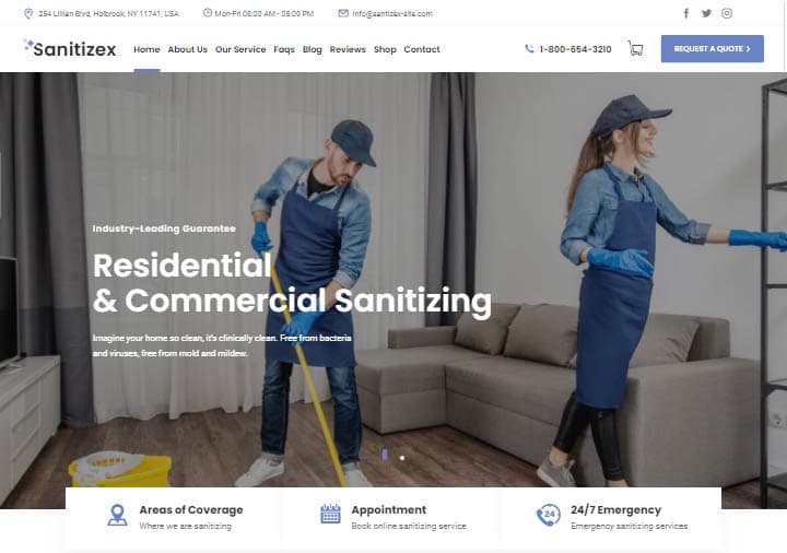 ไม่ว่าคุณจะให้บริการทำความสะอาดในประเทศ พาณิชยกรรม หรืออุตสาหกรรม หรือคุณให้บริการอื่นๆ ที่เกี่ยวข้อง เช่น การควบคุมสัตว์รบกวน Sanitizex อาจเป็นทางเลือกที่ดีสำหรับเว็บไซต์ของคุณ แม้ว่าคุณจะได้รับการสาธิตเว็บไซต์เพียงรายการเดียว แต่ก็ได้รับการออกแบบมาเป็นอย่างดีและรวมทุกอย่างที่เว็บไซต์ของคุณต้องการ