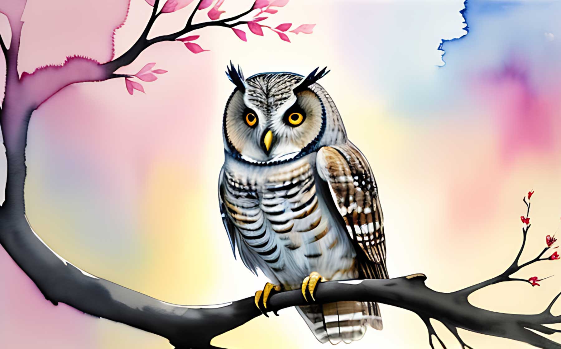 Prompt: ภาพวาดสีน้ำของนกฮูกนั่งบนกิ่งไม้, แสงตอนกลางวัน, มุมกว้าง