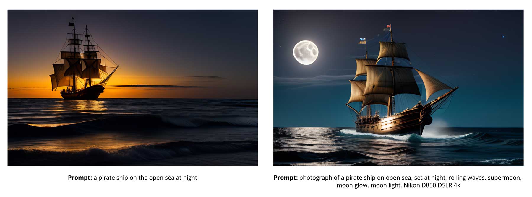 ตัวอย่างเช่น เราให้ Divi AI พร้อมคำแนะนำที่แตกต่างกันสองแบบสำหรับเรือโจรสลัด เพื่อให้คุณเห็นความแตกต่างของคำอธิบายสองสามคำ: