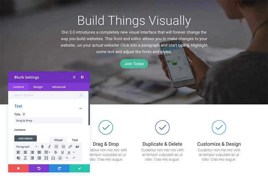 สิ่งที่ทำให้ผู้สร้าง Divi แตกต่างไปจากเดิมคือช่วยให้คุณสามารถเปลี่ยนเว็บไซต์ WordPress จากส่วนหน้าได้ ทำงานโดยแสดงการออกแบบของคุณแบบเรียลไทม์ ช่วยให้คุณเห็นได้ชัดเจนว่าแต่ละองค์ประกอบมีลักษณะอย่างไร