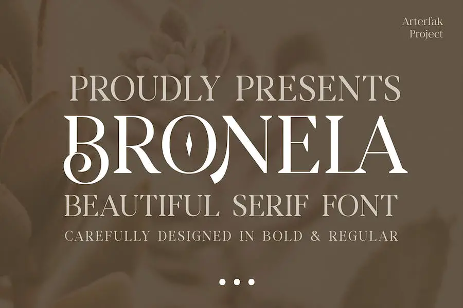 Bronela เป็นฟอนต์ serif ที่สวยงาม มีทั้งแบบปกติและแบบหนา แบบอักษรได้รับการออกแบบด้วยเซอริฟที่ชัดเจน คอนทราสต์สูง และให้ความรู้สึกหรูหรา โดยได้รับแรงบันดาลใจจากแบบอักษรข้อความแบบคลาสสิกและเทรนด์การพิมพ์ที่ทันสมัย เหมาะสำหรับวัตถุประสงค์ต่างๆ ด้วยสไตล์อเนกประสงค์ที่สามารถใช้ได้ทั้งขนาดใหญ่หรือขนาดเล็ก และทั้งโครงการผู้หญิงและผู้ชาย