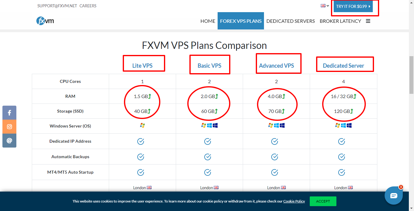 FXVM มีแผนราคา VPS สามแผน LiteFX VPS ราคา 19 เหรียญต่อเดือนสำหรับ RAM 1.5GB และ ROM 40GB คุณจะได้รับที่อยู่ IP เฉพาะ แพลตฟอร์มในตัว และการสำรองข้อมูลช่วงสุดสัปดาห์