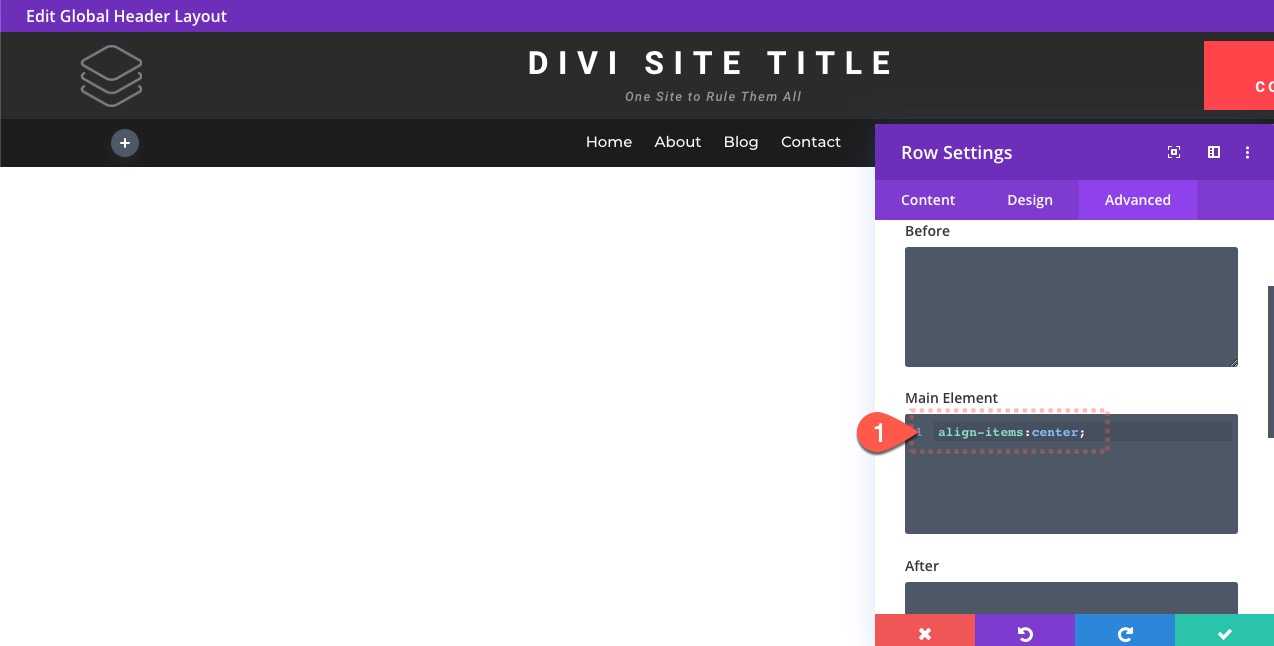ตอนนี้แถวบนสุดคือ "Equalize Column Heights" ที่ใช้งานอยู่ซึ่งใช้คุณสมบัติ flex เราสามารถใช้ประโยชน์จากสิ่งนี้ได้โดยการเพิ่มข้อมูลโค้ด css เล็กๆ เพื่อให้แน่ใจว่าคอลัมน์ทั้งหมดยังคงกึ่งกลางแนวตั้งภายในแถว ในการดำเนินการนี้ ให้เปิดการตั้งค่าสำหรับแถวบนสุดและเพิ่ม CSS ต่อไปนี้ในองค์ประกอบหลัก: