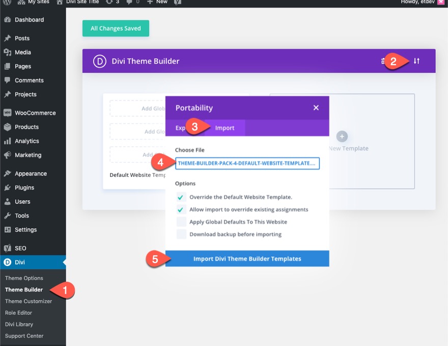 หากต้องการนำเข้าเทมเพลต ให้ไปที่ Divi > Theme Builder