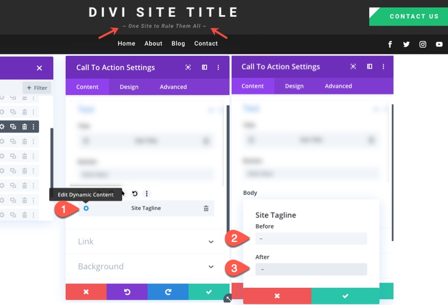 องค์ประกอบเนื้อหาแบบไดนามิกแต่ละรายการสามารถแก้ไขได้โดยคลิกที่ไอคอนรูปเฟือง หากต้องการเพิ่มอักขระก่อนและหลังลงในแท็กไลน์ ให้เปิดการตั้งค่าสำหรับโมดูลการเรียกร้องให้ดำเนินการที่มีแท็กไลน์ และคลิกไอคอนแก้ไขบนเนื้อหาแบบไดนามิกของแท็กไลน์ของไซต์ จากนั้นเพิ่มอักขระลงในอินพุตก่อนและหลัง