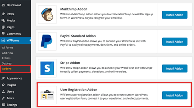 หลังจากการตรวจสอบแล้ว คุณต้องไปที่หน้า WPForms » Addons เลื่อนลงเพื่อค้นหา 'Addon การลงทะเบียนผู้ใช้'