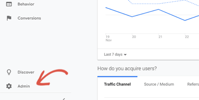 ก่อนอื่น คุณจะต้องไปที่แดชบอร์ดบัญชี Google Analytics ของคุณแล้วคลิกตัวเลือก 'ผู้ดูแลระบบ'