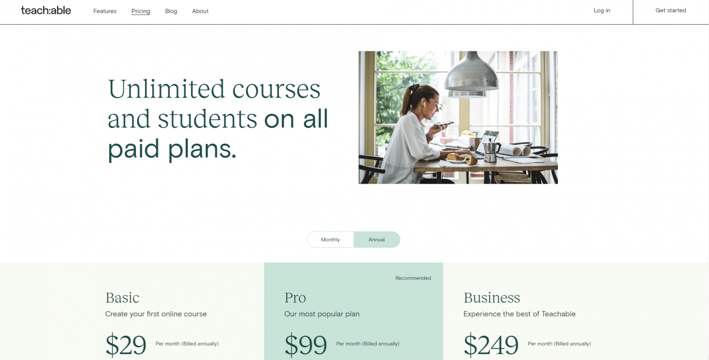 ดังที่กล่าวไว้ Teachable มีนักเรียนและหลักสูตรไม่จำกัดในแผนชำระเงินทั้งหมด แผนเริ่มต้นที่ $29/เดือน (เมื่อคุณจ่ายเป็นรายปี) สำหรับแผนพื้นฐาน และไปที่แผนธุรกิจที่ $249/เดือน