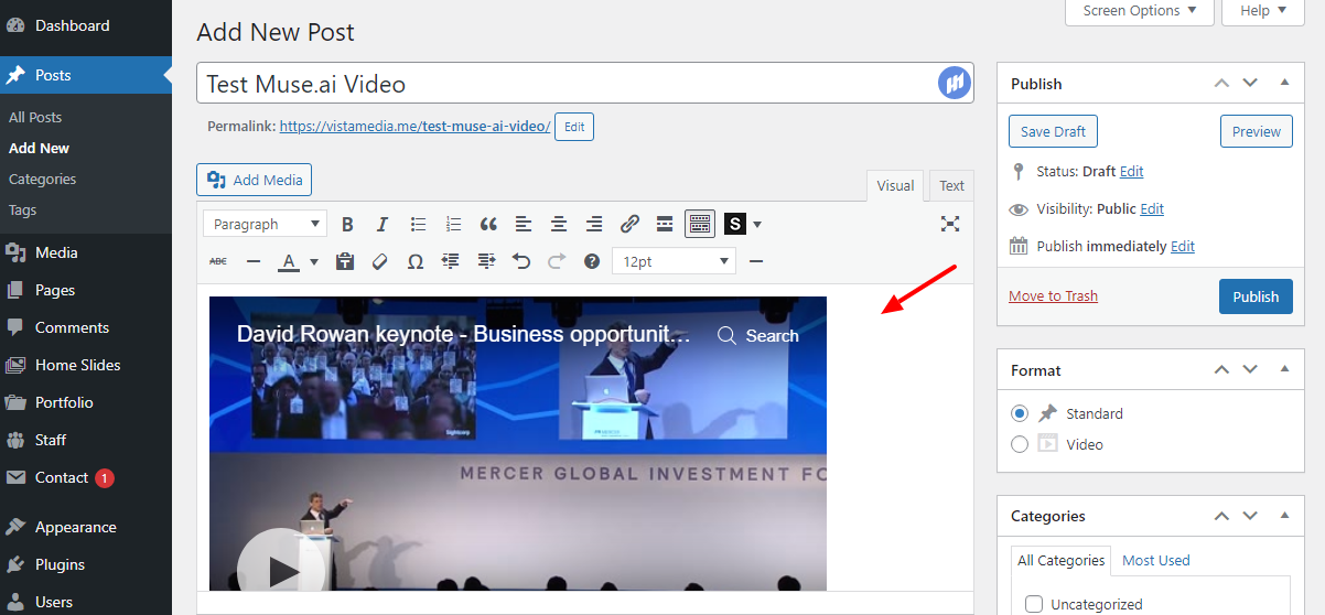 และนั่นคือทั้งหมดที่มี – คุณไม่จำเป็นต้องกำหนดการตั้งค่าใดๆ แต่คุณจะเพิ่มวิดีโอ muse.ai ลงใน WordPress ได้อย่างไร นั่นเป็นเรื่องง่าย คุณเพียงแค่ต้องคัดลอกและวาง URL ของวิดีโอลงในโพสต์หรือหน้าใหม่ คุณยังสามารถใช้รหัสย่อเพื่อปรับแต่งวิดีโอของคุณได้