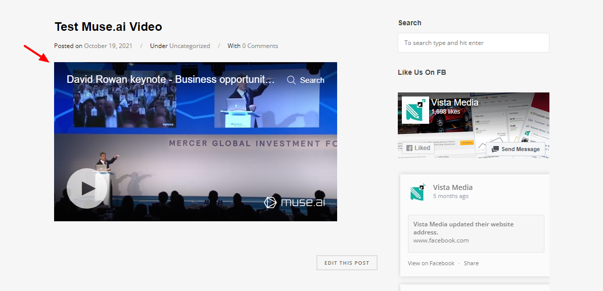 ตอนนี้ หากคุณตรวจสอบโพสต์ในส่วนหน้า คุณจะพบวิดีโอ muse.ai ของคุณ: