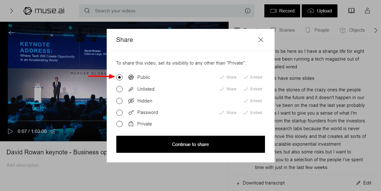 ในกล่องโต้ตอบที่ปรากฏขึ้น ให้เลือก สาธารณะ (หรืออย่างอื่นที่ไม่ใช่ ส่วนตัว ) แล้วคลิก ดำเนินการต่อเพื่อแชร์ ตามที่แสดงใน screengrab ด้านล่าง