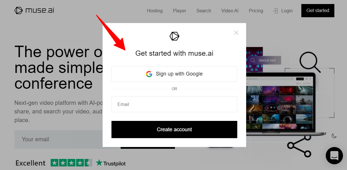 ประการแรก คุณสามารถเริ่มต้นด้วยการทดลองใช้ฟรีหรือช่วงฤดูใบไม้ผลิสำหรับแผนชำระเงินแบบใดแบบหนึ่งตามความต้องการของคุณ เริ่มต้นด้วยการชี้เบราว์เซอร์ของคุณไปที่เว็บไซต์ทางการของ muse.ai แล้วคลิกปุ่ม เริ่มต้น :