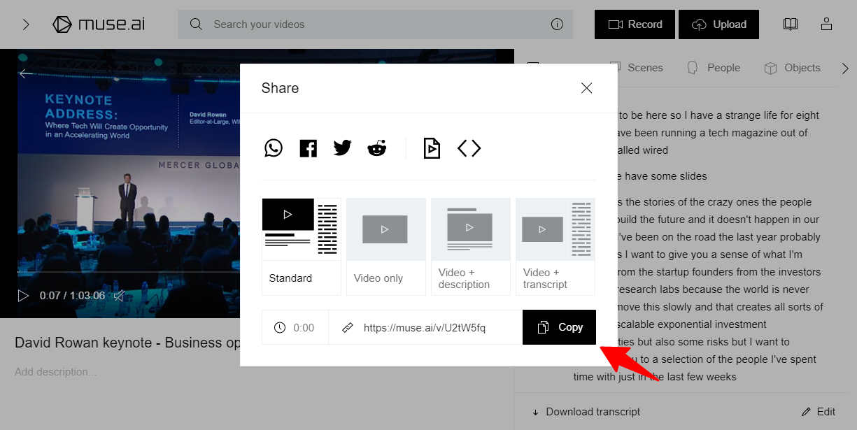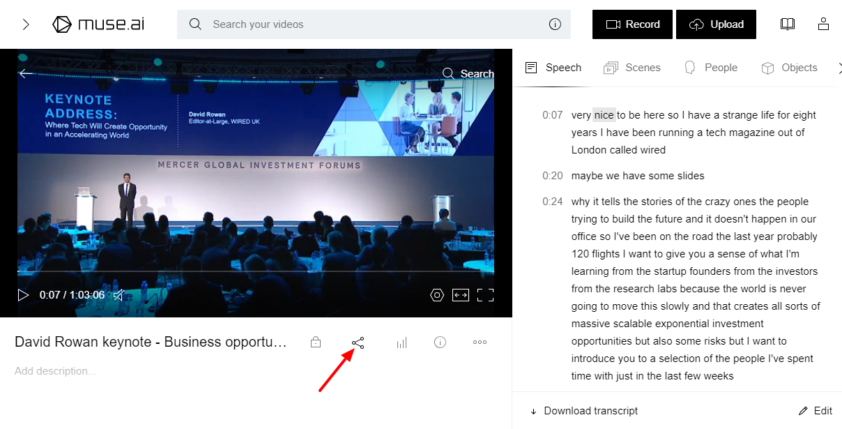 ตัวอย่างเช่น ฟีเจอร์ AI ช่วยให้คุณระบุใบหน้า คำ และวัตถุอื่นๆ ในวิดีโอของคุณโดยอัตโนมัติ ยิ่งไปกว่านั้น AI ยังแบ่งวิดีโอของคุณออกเป็นหลายฉากและสร้างการถอดเสียงเป็นคำโดยอัตโนมัติ นอกจากนี้ คุณสามารถบันทึกวิดีโอโดยตรงใน muse.ai และจัดระเบียบทุกอย่างในคอลเลกชัน