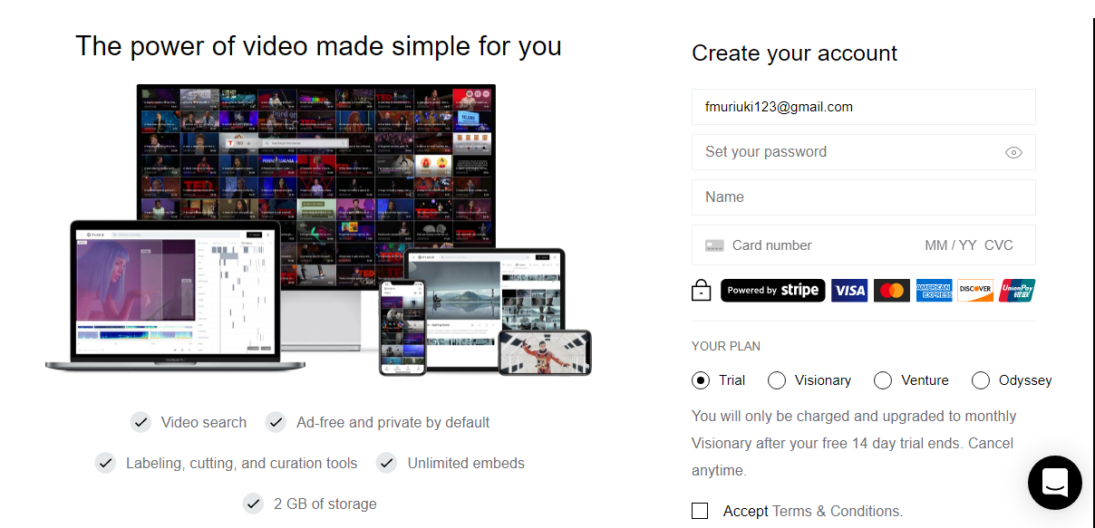 นอกจากนี้ muse.ai ยังให้คุณทดลองใช้ฟรี 14 วันเพื่อทดสอบน่านน้ำ ต้องใช้บัตรเครดิต แต่คุณจะถูกเรียกเก็บเงินหลังจากสิ้นสุดช่วงทดลองใช้ 14 วันเท่านั้น คุณสามารถยกเลิกได้ตลอดเวลาเนื่องจาก muse.ai ไม่ได้ผูกมัดคุณในสัญญา เนื่องจากเป็นคุณลักษณะของเว็บไซต์โฮสต์วิดีโอหลายแห่ง