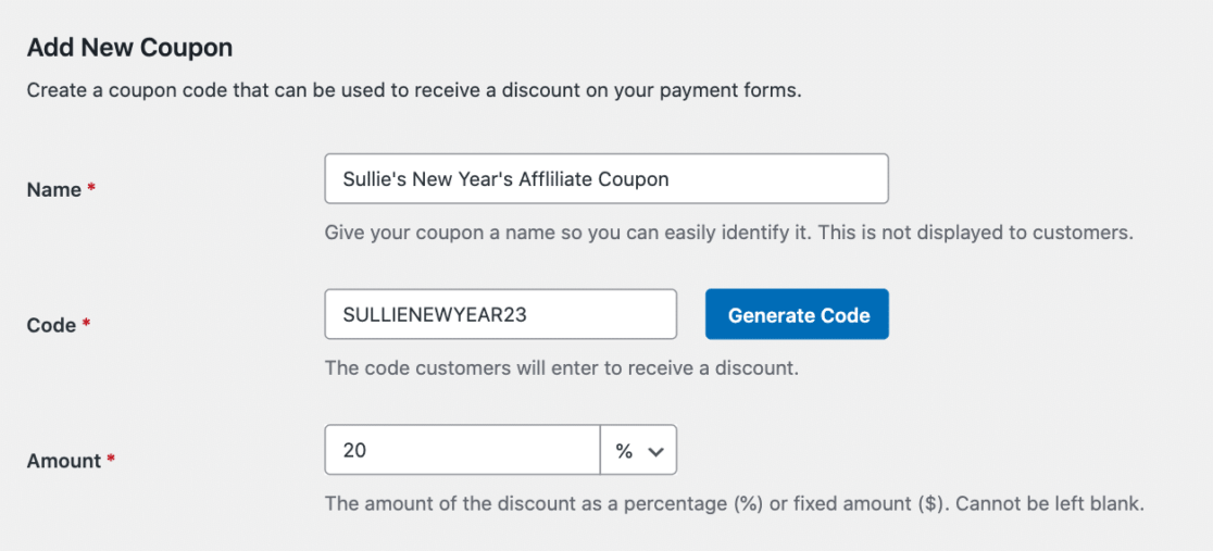 คุณจะสร้างรหัสคูปองและสามารถกำหนดวันที่เริ่มต้นและวันที่สิ้นสุดได้หากต้องการ แต่คราวนี้ คุณจะยืนยันในเมนูแบบเลื่อนลงว่าช่องจำนวนเงินถูกกำหนดเป็นจำนวนเงินคงที่สำหรับเงินสด แทนที่จะเป็นเปอร์เซ็นต์