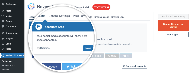 เมื่อเปิดใช้งานแล้ว คุณจะสามารถเข้าถึงปลั๊กอินได้จากเมนูผู้ดูแลระบบด้านซ้าย สิ่งแรกที่คุณต้องทำคือให้สิทธิ์ Revive Old Posts ในการโพสต์ไปยังบัญชีโซเชียลมีเดียของคุณ ลงชื่อเข้าใช้บัญชีของคุณเพียงไม่กี่คลิก