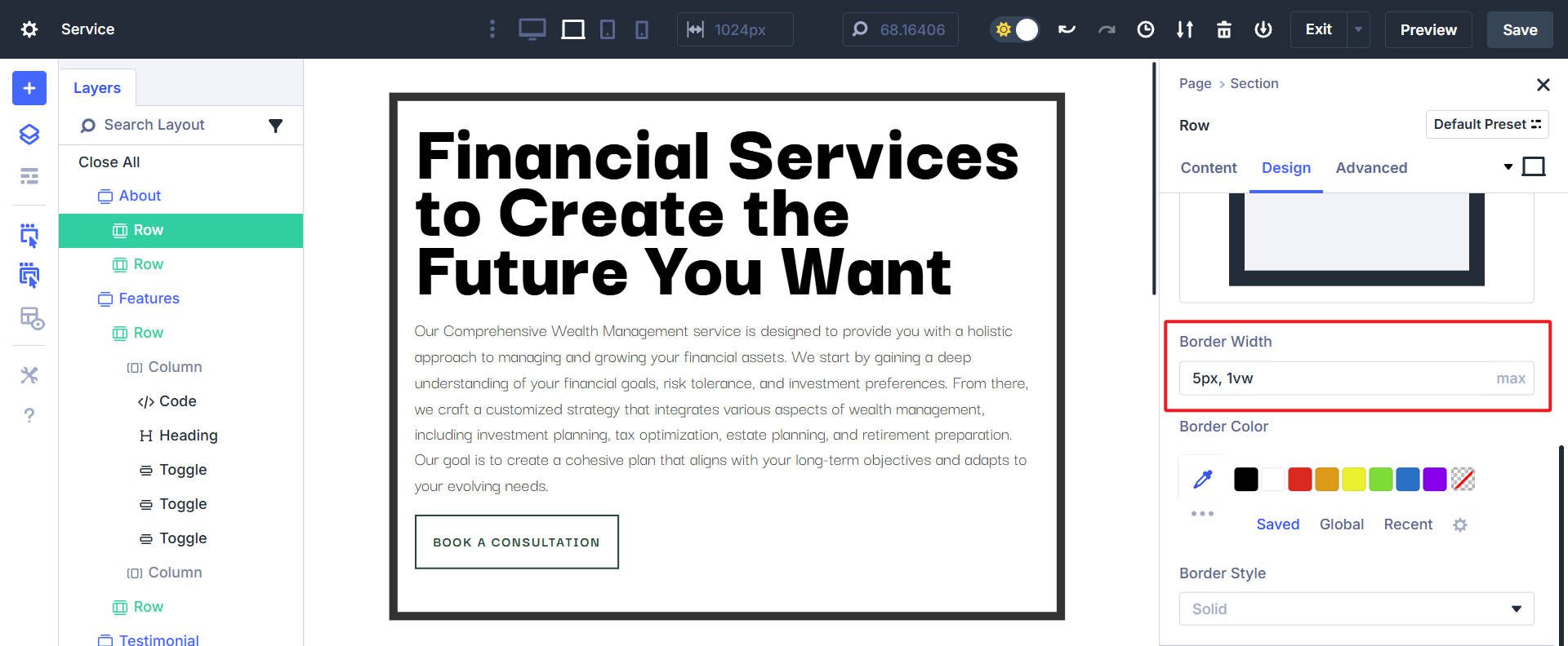 นี่คือสิ่งที่ max () ในสถานการณ์นี้ดูเหมือนในการออกแบบ> ชายแดน>ความกว้างของชายแดนในแถวใน Divi: