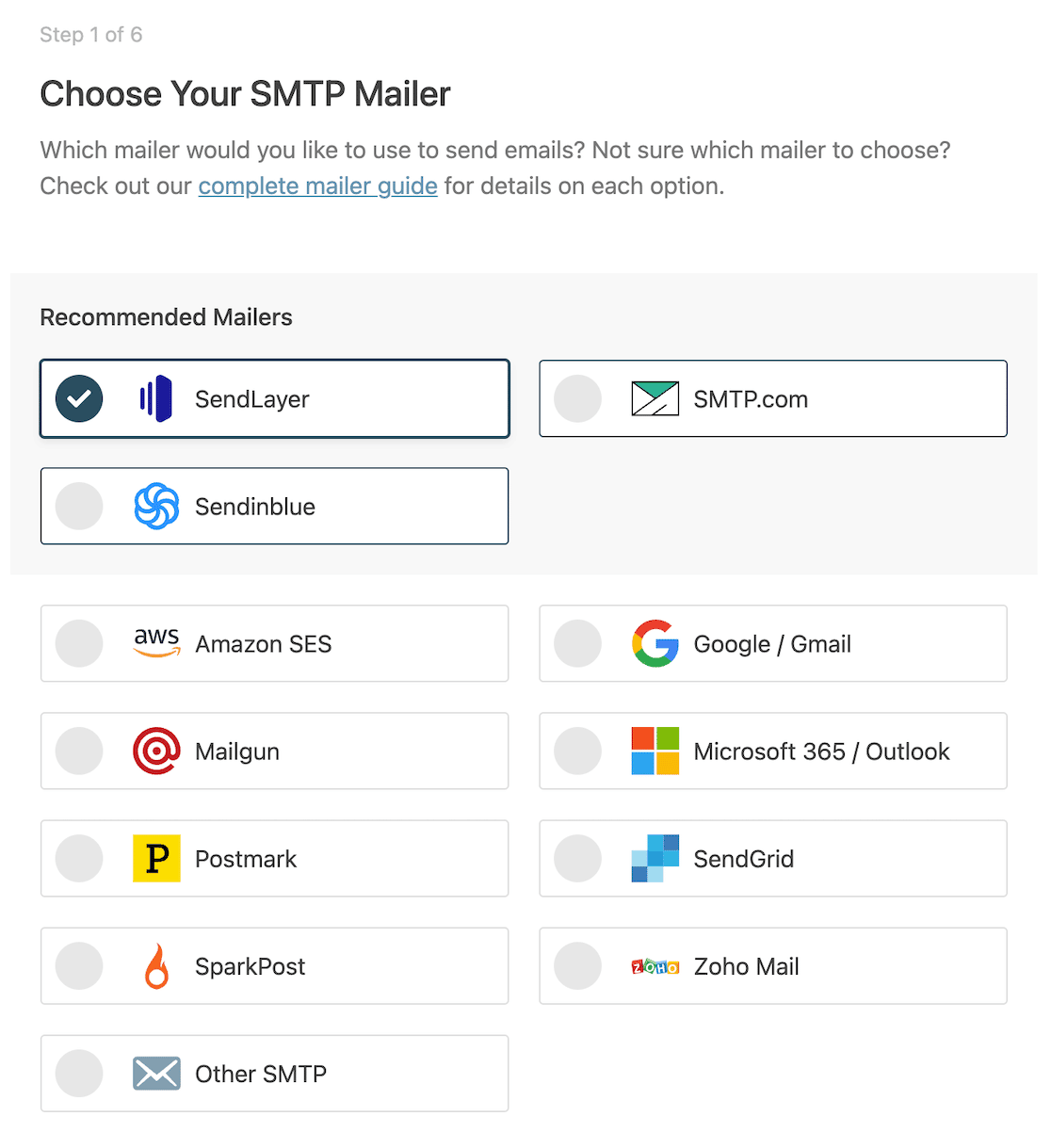 WP Mail SMTP แก้ไขปัญหาทั้งสองนี้โดยช่วยให้คุณเชื่อมต่อไซต์ของคุณกับบริการของบุคคลที่สามที่จะส่งอีเมล WordPress ทั้งหมดของคุณ เราเรียกแพลตฟอร์มประเภทนี้ว่า Mailer และคุณจะเริ่มต้นด้วยการเลือกว่าต้องการใช้แพลตฟอร์มใด