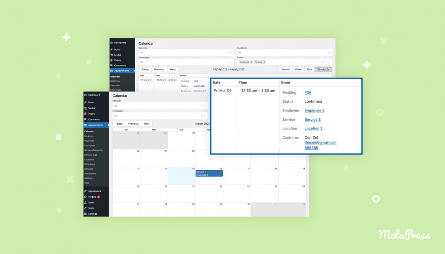 ปลั๊กอินการจองสามารถประมวลผลการชำระเงินออนไลน์ คุณสามารถจัดการพนักงานและกำหนดการนัดหมายอัตโนมัติ ควบคุมการจองและการแจ้งเตือน และทำสิ่งต่างๆ ได้มากขึ้นจากแดชบอร์ดเดียวของไซต์ WordPress ของคุณ