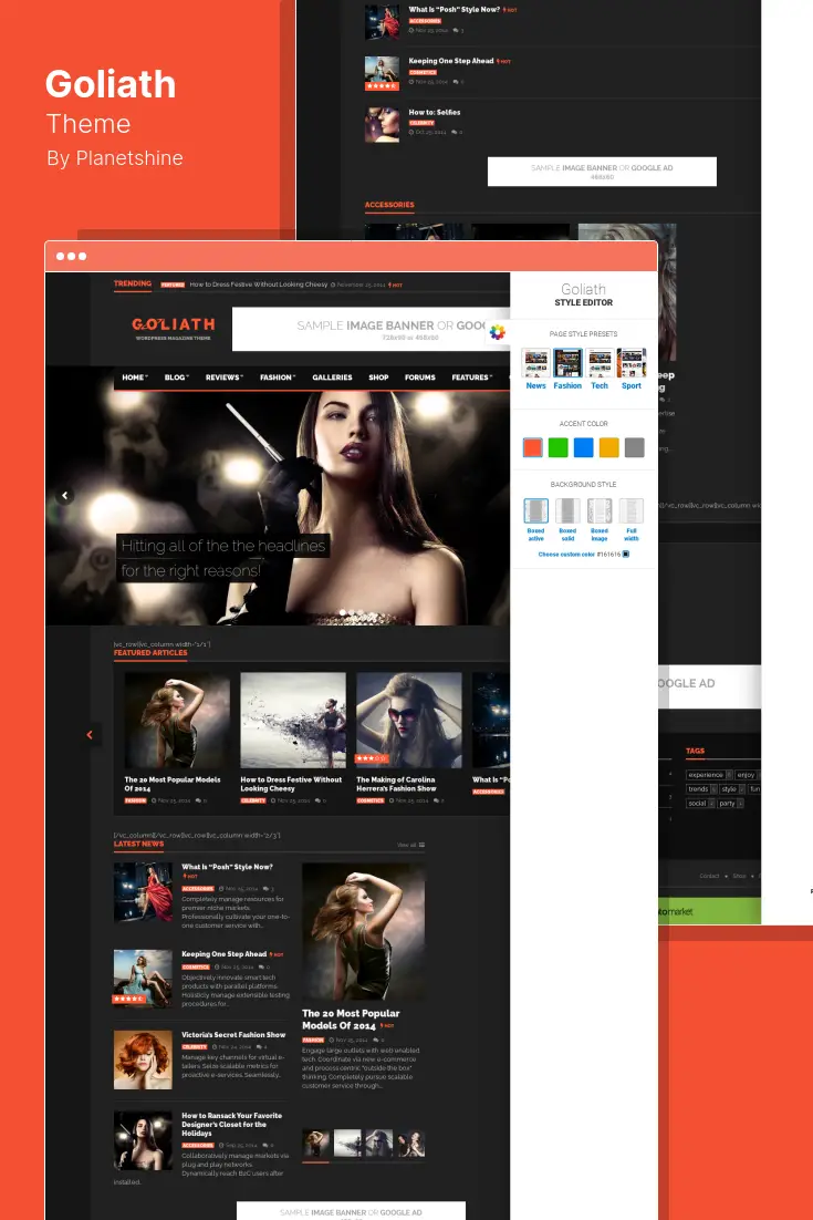 Goliath เป็นธีม WordPress ที่ตอบสนองได้ซึ่งปรับให้เข้ากับโทรศัพท์มือถือ แท็บเล็ต และคอมพิวเตอร์ ทำให้เหมาะสำหรับข่าวสารและบทวิจารณ์ มีระบบการให้คะแนนในตัว เครื่องมือสรุป และการแสดงรีวิวผลิตภัณฑ์ในการค้นหาโดย Google