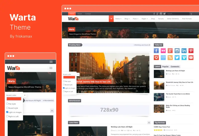 Warta นำเสนอชุดสี 16,581,375 ชุด และสี่สไตล์ และผสานรวมไอคอน Font Awesome และแบบอักษรของ Google ชุดรูปแบบนี้ยังรองรับ WooCommerce และ bbPress รวมถึงรองรับ WPML