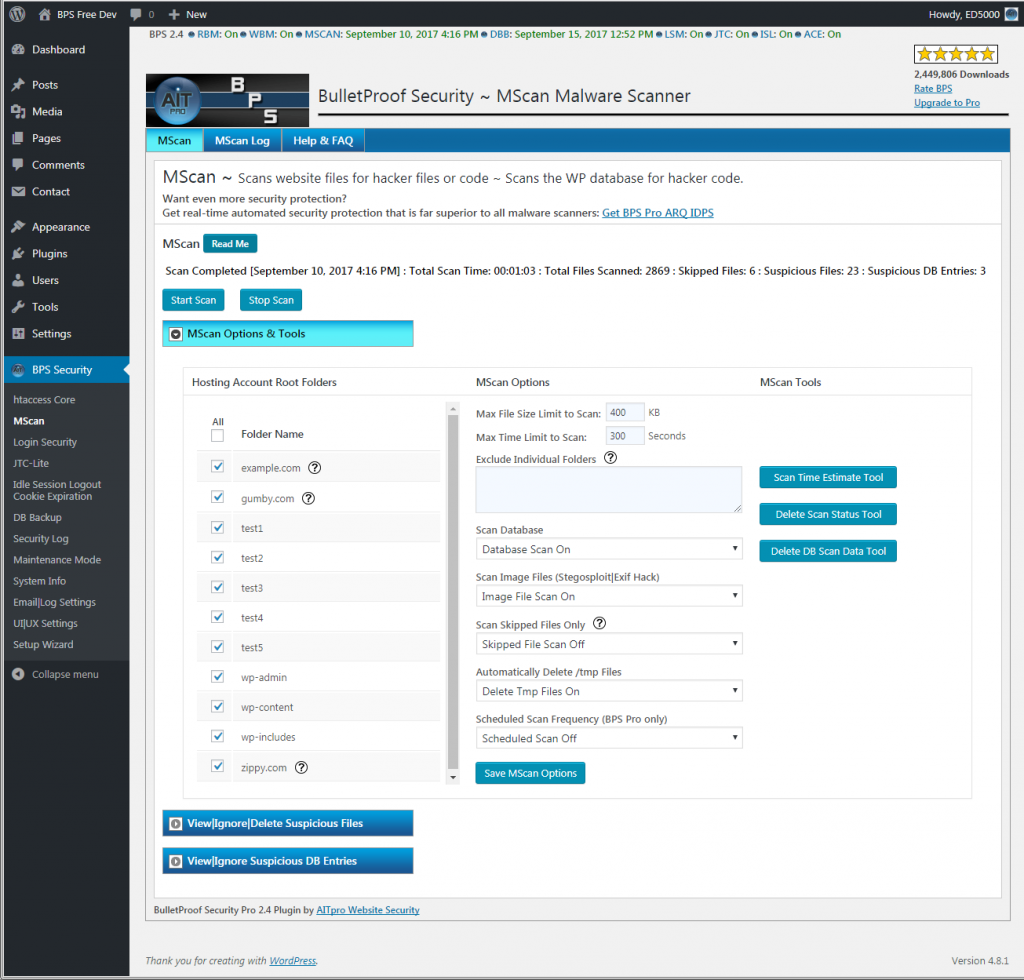Yukarıdaki ekran görüntüsü, kötü amaçlı yazılım taramalarının şüpheli dosyalar ve şüpheli DB girişleri dahil olmak üzere ayrıntılı raporlarla nasıl sonuçlandığını gösterir. Eklenti, diğer özellikler arasında benzer şekilde ayrıntılı içgörülere sahiptir.