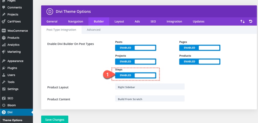 Divi'nin CartFlows ile çalışması için Divi > Tema Seçenekleri > Oluşturucu > Yazı Tipi Entegrasyonu altında "Adımlar" özel yazı tipini etkinleştirmeniz gerektiğini unutmayın.