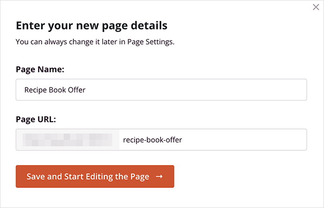 Ardından, sayfanıza bir ad verebileceğiniz bir açılır pencere göreceksiniz. SeedProd sayfaya otomatik olarak bir URL verecektir, ancak isterseniz bunu daha sonra değiştirebilirsiniz.