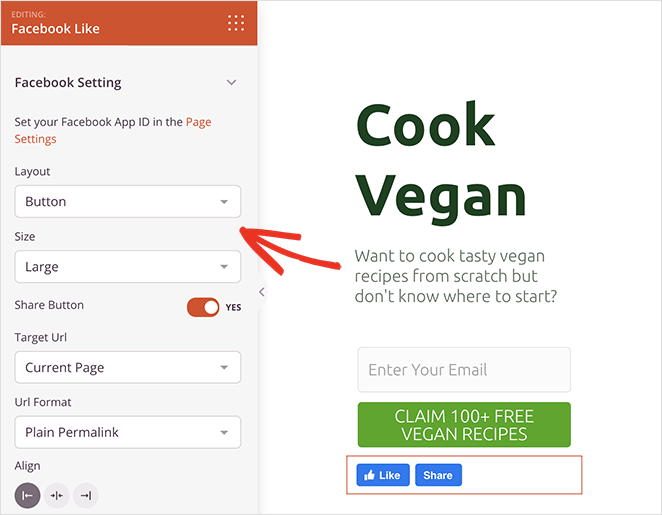 Bundan sonra, Beğen düğmesi düzenini ve boyutunu seçmek için ayarları yapmanız yeterlidir. Ayrıca Beğen düğmesinin bir önizlemesini de göreceksiniz.