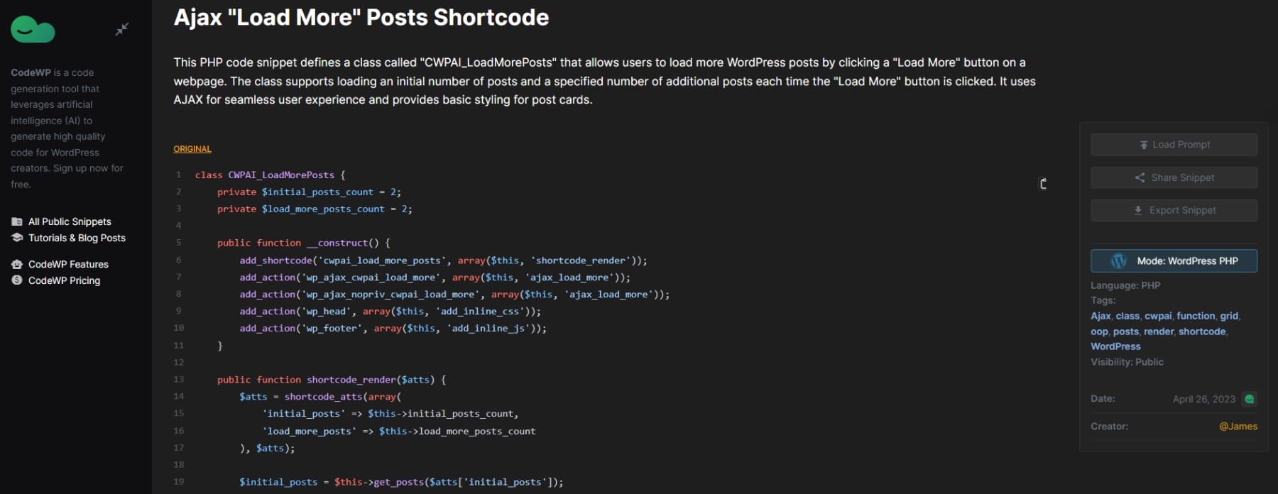 CodeWP.ai ayrıca kopyalayıp yapıştırmaya hazır çok sayıda önceden kodlanmış ve incelenmiş snippet içerir. AI tarafından oluşturulan önceden hazırlanmış kod parçacıkları, WooCommerce için genel PHP kullanım durumlarını, standart WordPress kurulumlarını ve Breakdance ve Oxygen oluşturucuları için bazı çözümleri kapsar.