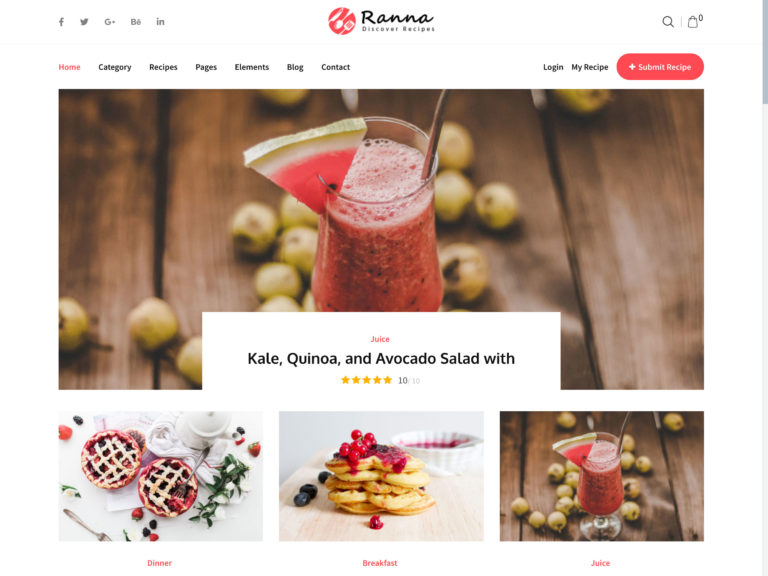 Ranna WordPress teması, yemek ve yemek tarifi blogları için mükemmel bir seçimdir. Gerçekten çarpıcı bir web sitesi oluşturmak için ihtiyacınız olan tüm özellikleri ve seçenekleri içerir. Bu temaya iki ana sayfa varyasyonu, iki kategori sayfası, iki tarif sayfası ve daha fazlasını içeren bir dizi düzen seçeneği dahildir. Ayrıca üç başlık stili, beş alt bilgi ve bir dizi Elementor eklentisi ve düzeni ile birlikte gelir.