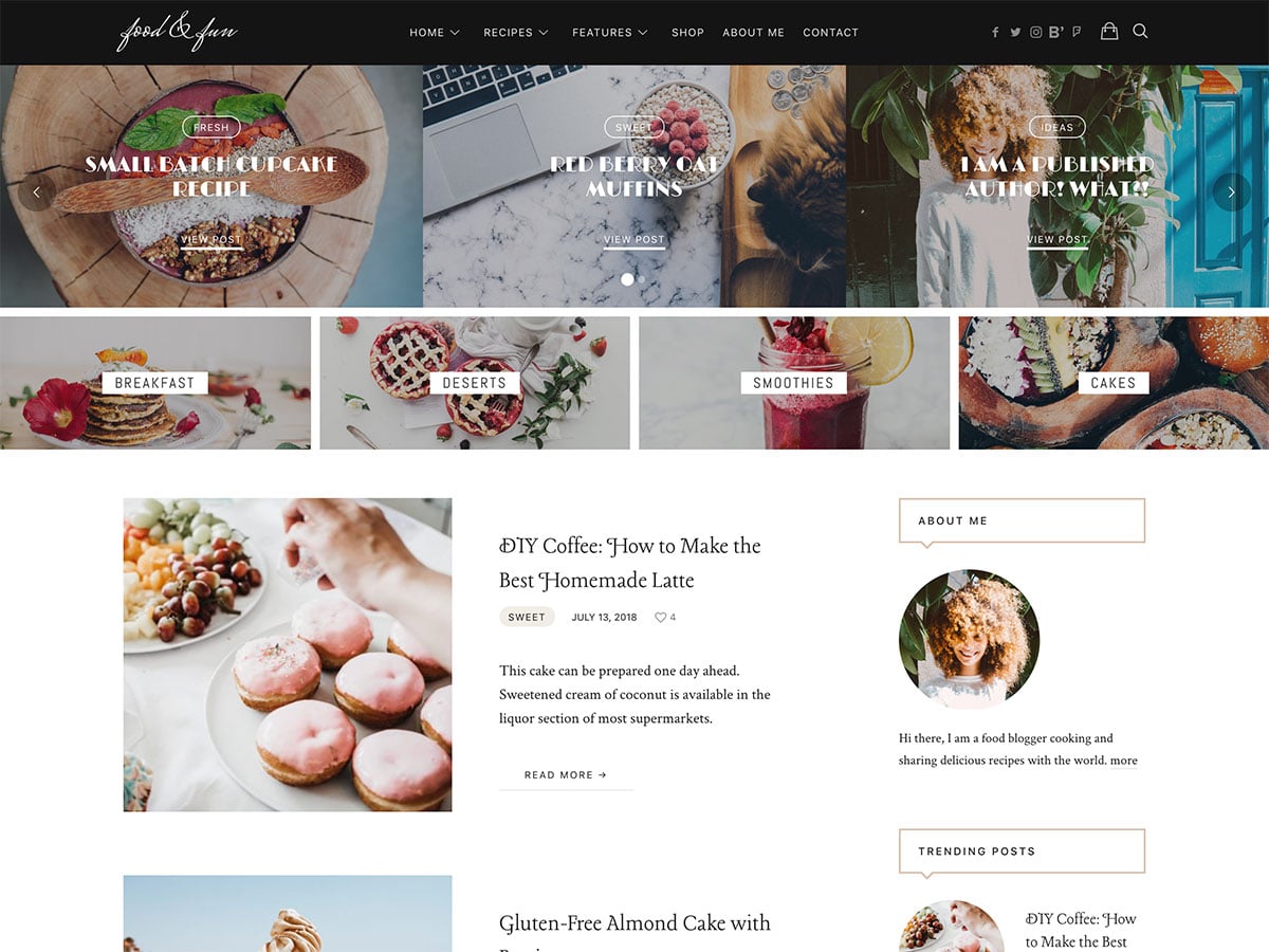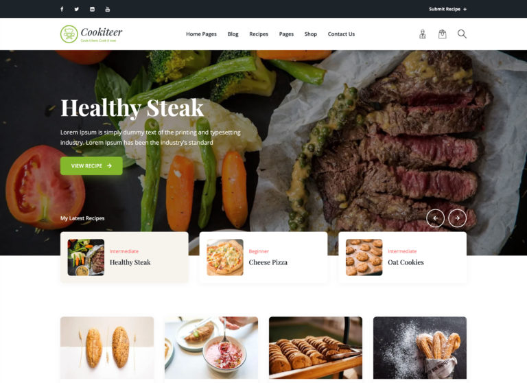 Bu tema, tek bir tıklamayla yükleyebileceğiniz bir dizi demo ile birlikte gelir. En son tariflerinizi veya blog gönderilerinizi göstermek için bir ana sayfa kaydırıcısına sahiptir. Renkli düğmeler, harekete geçirici mesajların tanınmasını kolaylaştırır. Ayrıca e-ticaret uyumluluğu, sosyal medya entegrasyonu ve daha kolay gezinme için bir arama işlevi vardır. Dikkate değer diğer birkaç özellik, birden çok sayfa stili, blog stili, tarif stili ve kısa kodu içerir.