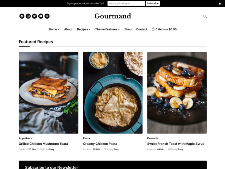 Gıda cephesinde, Gourmand, belirli tarif kategorilerini sergilemenize ve ayrıca pişirme süresi ve zorluğuna sahip olmanıza olanak tanıyan harika tarif kartlarıyla bir yumruk sunuyor. Ziyaretçiler, okuyucuların seveceği bir kullanım kolaylığı ve rahatlık özelliği olan tarife tıklamadan önce tüm bu özellikleri görebilir.
