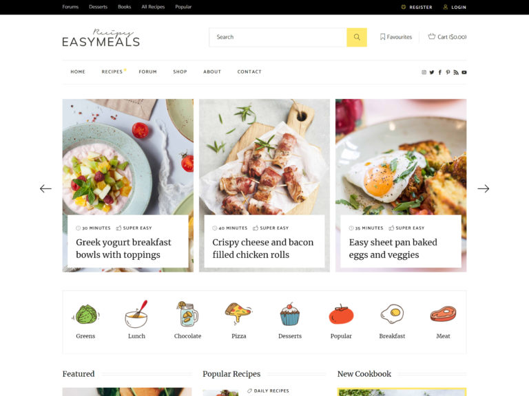 EasyMeals, çoğu insanın çekici bulması gereken tarifleri çevrimiçi yayınlamak için çok yönlü bir WordPress yemek temasıdır.